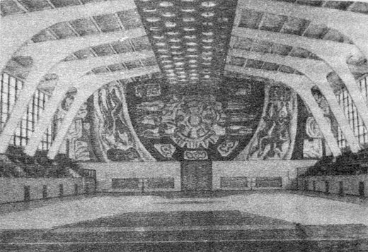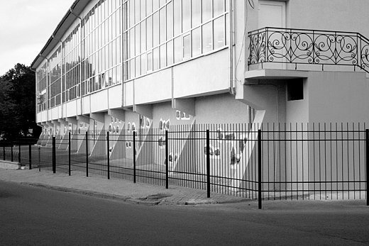 Величезні панно, барельєфи, горельєфи виконували дуже важливу функцію зрозумілості споруди. Адже кожен витвір містив якийсь конкретний малюнок людей і їхньої поведінки, що легко читалося пролетарями зі стін споруди, прямо вказуючи на її призначення, навіюючи настрій, який узгоджувався з соціальним призначенням споруди. Звідси цілком зрозуміло, що в цій школі панно зробили на спортивну тематику. Через 50 років після будівництва величезне панно ще зберігається у залі спортшколи.
