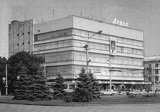 Того ж року група архітекторів видала проект центрального універмагу "Луцьк". Прямокутний паралелепіпед зі скла, бетону й металу став одним із кількох масивних споруд, які почали формувати Театральний майдан.