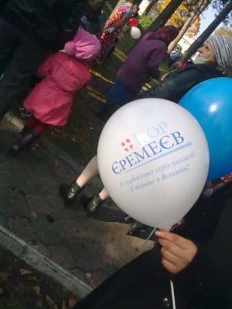 На святі було кількадесят дітей і батьків. Їм роздавали надувні кульки із передвиборними гаслами кандидата: «Ігор Єремеєв. З турботою про людей! З вірою у Волинь!»