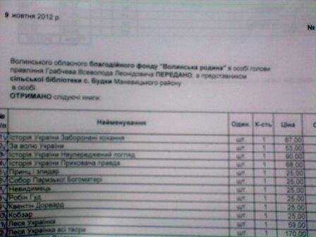 Книги бібліотекарі приймали по Акту підготовленому Волинським обласним благодійним фондом «Волинська родина» окремо на кожну сільську бібліотеку. Так, як представників сільських бібліотек не було для написання прізвища та ім’я, то для цього було залишено місце в документі.