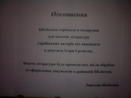 Про це сповіщають оголошення на вхідних дверях бібліотеки зі словами вдячності. Причетність до такого «благодійництва» кандидата не заперечували й самі працівники установи у розмові зі спостерігачами ОПОРИ.
