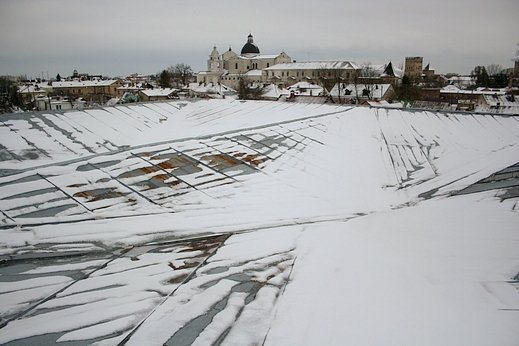Виявилося, що вони ведуть на горище синагоги. Тут стало ясно, що ця одна із найцінніших пам'яток Луцької давності перебуває в плачевному стані. Дах протікає посередині. Покритий він звичайною бляхою. Дивна конструкція даху не виводить воду за межі споруди, а накопичує її посередині в заглибленні даху. Тому коли дощ чи сніг вище нуля - обов'язково вода протікає всередину.