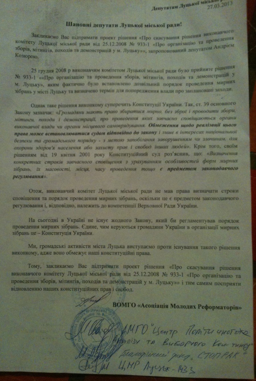 По-третє. «Порядок…» виконкому Луцької міської ради порушує не тільки ЗУ «Про місцеве самоврядування…», а й саму Конституцію України. Зокрема, він передбачає, що організатори мирного зібрання мають не повідомляти місцеву владу про акцію, а отримувати дозвіл на проведення мирного зібрання. Це – перше.
