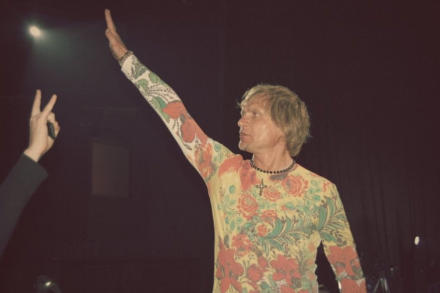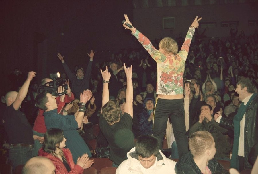 А потім Олег Скрипка пішов в зал. Потрусив животом, заспівав народних пісень, почитав жінкам вірші, загалом розшевелив людей і повернувся на сцену співати так звану "Закустику".