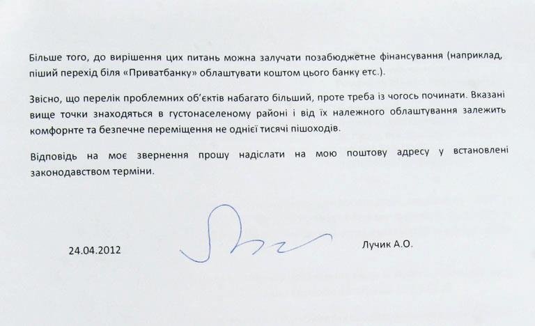 Тому пропоную з коштів, які виділяються в бюджеті на ремонт доріг, хоча би відсотків 10 спрямовувати на ремонт тротуарів та пішохідних доріжок.
