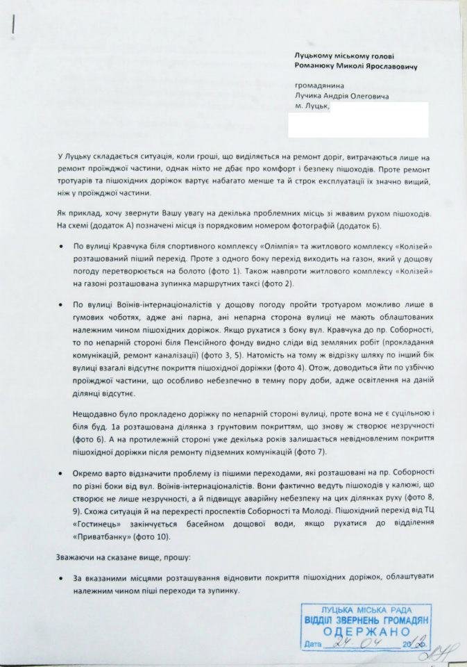 Вперше я звернувся до міської влади із проблемою тротуарів на Воїнів-інтернаціоналістів у квітні 2012 року. Тоді подав звернення з детальним фотозвітом та позначенням на карті проблемних точок.