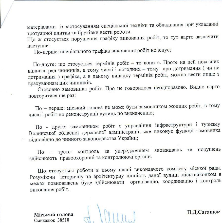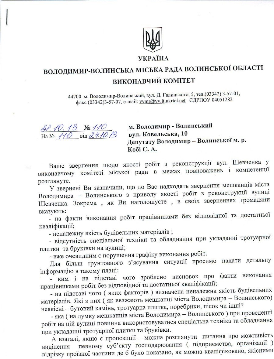 24 жовтня 2013 року я, як депутат Володимир-Волинської міської ради, направив на ім’я міського голови Петра Саганюка депутатське звернення з приводу якості робіт із реконструкції вулиці Шевченка. Як не дивно, але замість відповіді на цілком конкретні питання, по суті отримав від мера-«господарника» древнього княжого міста відповідь, яку інакше, як дешевою формальною відпискою, назвати важко.