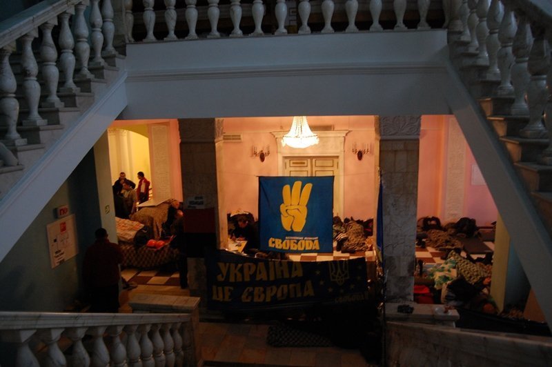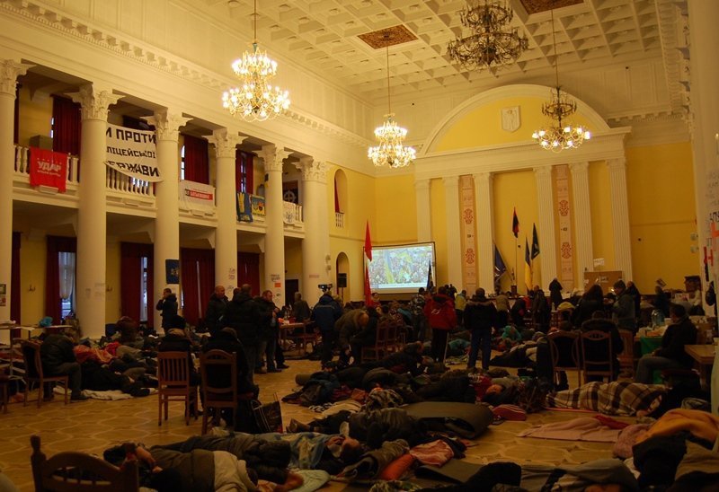 Пішли до Будинку профспілок. Там – те ж саме. Але тут вже, наче у вулику. Кипить робота на кухні. Без дозволу туди не втрапити. В коридорах сплять втомлені майданівці. Все чітко: кожен регіон має своє місце.