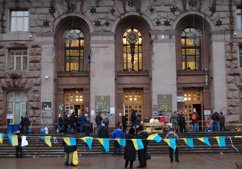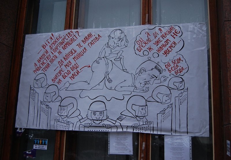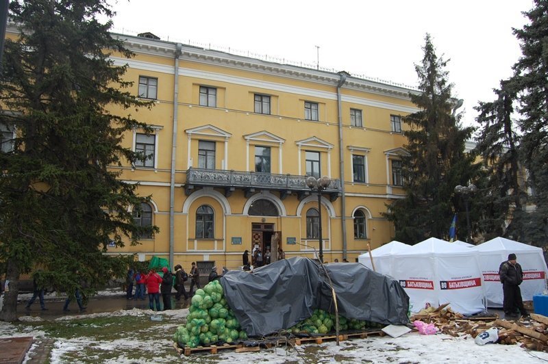 Світає. Йдемо на екскурсію до КМДА. Пускають не всіх. Порядок, самоорганізація на вищому рівні. В середині – сонне царство. Хтось дивиться новини, хтось дрімає. Дівчинка з медпункту робить масаж хлопчині, інша пані в білому халаті пояснює старшому мужчині, як приймати якісь там пігулки. Хтось уже прокинувся, а хтось щойно прийшов й шукає місце, де б примоститися й перепочити. Охорона працює відмінно, пильно придивляються до всіх. Хтозна, може, провокатор прийде білим і пухнастим?