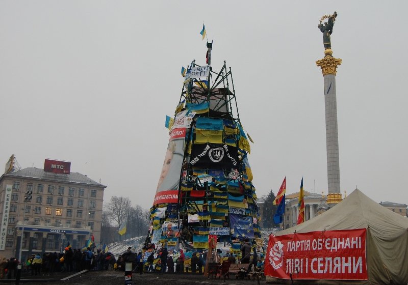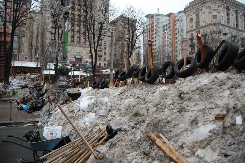 Зустрічає один хороший хлопець, який вже провів тут не один день, який будував барикади і протистояв силовикам. Обіймаємося. О-о-о, цей запах диму, в ньому щось особливе! Показує мені ще зовсім сонний Майдан, вражаюче міцні барикади, наметове містечко, революційну йолку і навіть поваленого вождя без голови.