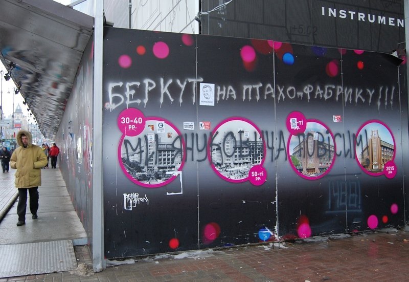 А ось і вулиці Інститутська. Стільки разів чула цю назву, але не до кінця розуміла, де вона. Вивчаю Київ. Столиця рясніє антивладними наліпками і гаслами, які в запалі майданівці писали, де заманеться. Не дуже схвалюю, але розумію: революційна необхідність.