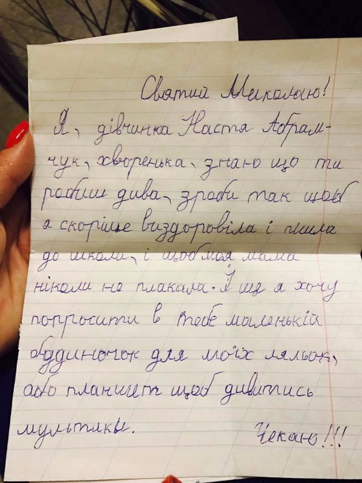 «Дорогий святий Миколаю!!! Шукаємо твоїх помічників! Настуся 2 дні думала і сама написала тобі листа... там її мрії...
