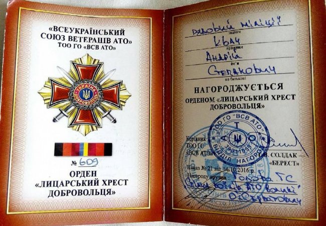 Нагородив його "Всеукраїнський союз ветеранів АТО".