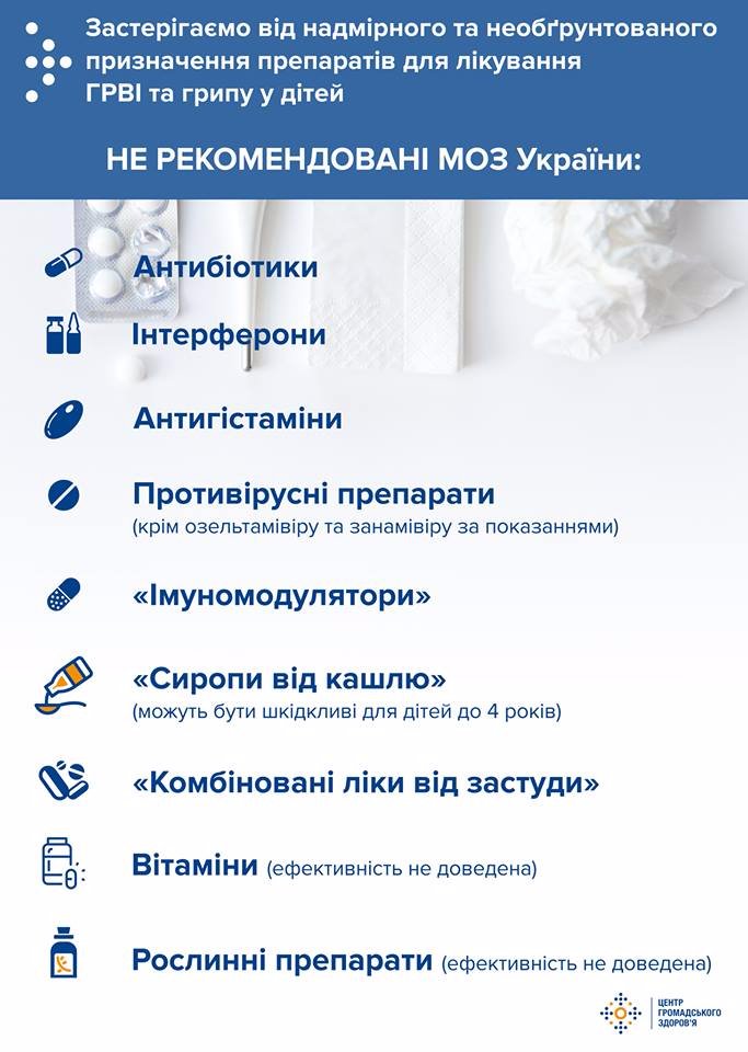 Факти дізналися у Міністерстві охорони здоров’я, які ліки приймати не потрібно у випадку грипу чи ГРВІ у дітей. У списку – антибіотики, інтерферони, імуномодулятори, сиропи від кашлю та рослинні препарати.