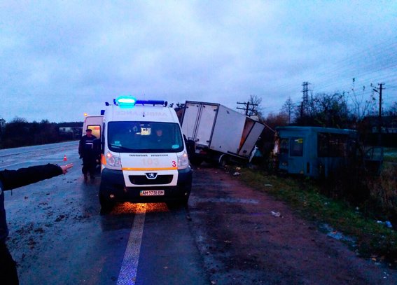 Так, за попередньою інформацією, 19-річний водій автомобіля Мersedes Sprinter, рухаючись у напрямку Житомира, не вибрав безпечної швидкості руху та не впорався з керуванням, у результаті чого бус зіткнувся з маршрутним мікроавтобусом, що рухався попереду.