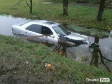 На Волині сталася аварія, під час якої автомобіль Mercedes збив стовп та злетів у канал з водою.