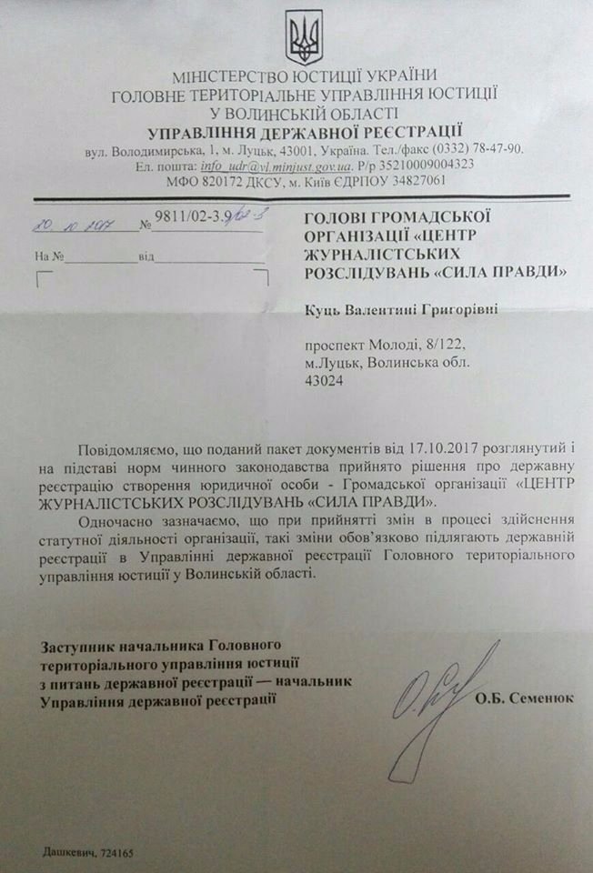 Управління юстиції офіційно зареєструвало громадську організацію «Центр журналістських розслідувань «Сила правди».