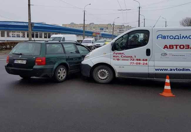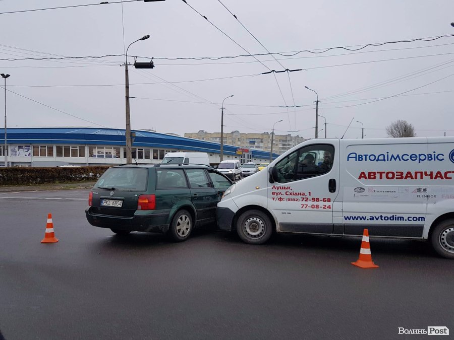 У Луцьку сталася аварія, під час якої зіткнулись два автомобілі Volkswagen Passat і Renault Trafic.