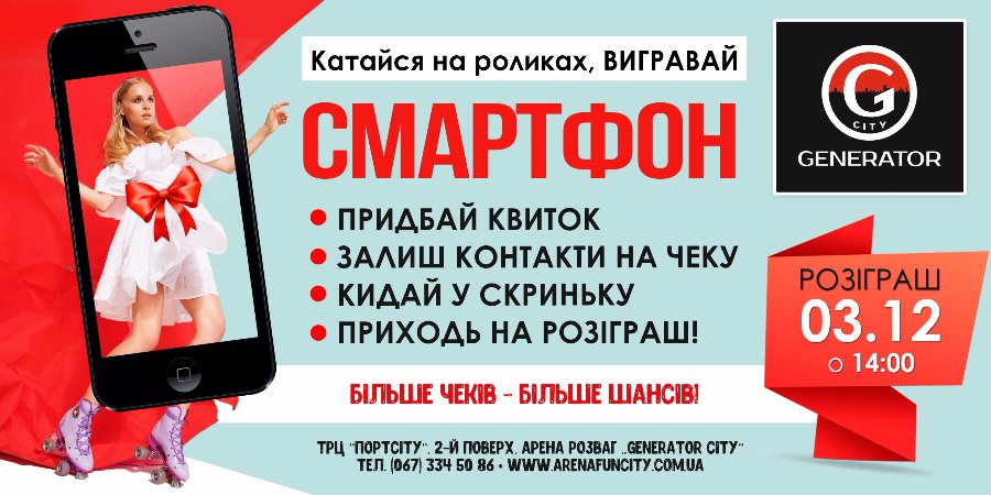 Черговий подарунок від «GeneratorCity» – смартфон. Для того, аби його отримати, потрібно придбати квиток на роледром, залишити на ньому контакти та вкинути у скриньку.