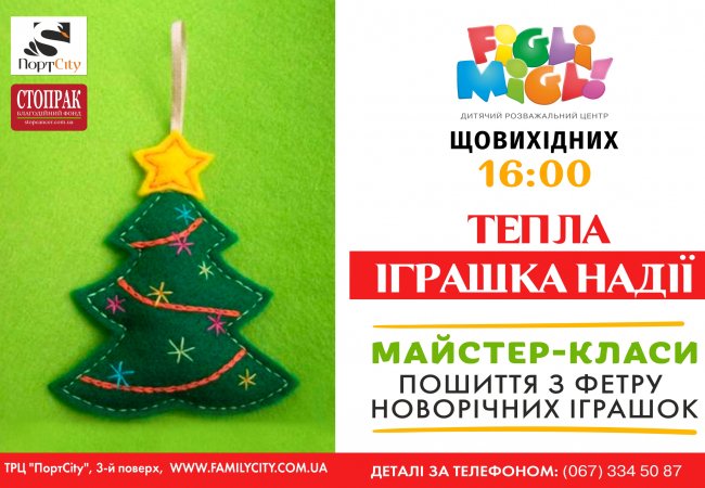 З 18 листопада стартують майстер-класи, під час яких усіх охочих навчатимуть виготовляти іграшки з фетру. Початок о 16 годині у дитячому розважальному центрі «Figli Migli». Майстерки відбуватимуться: 18, 19, 25, 26 листопада, а також 2 та 3 грудня. Вхід – благодійний внесок. Попередня реєстрація за телефоном: 095 480 75 88.