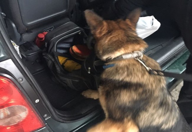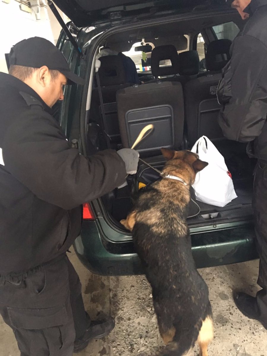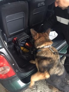 До огляду залучили службового собаку Тім, що навчений на пошук наркотиків та психотропів. Він і спрацював при огляді особистих речей пасажирів, вказуючи своєю поведінкою на наявність знайомих запахів.