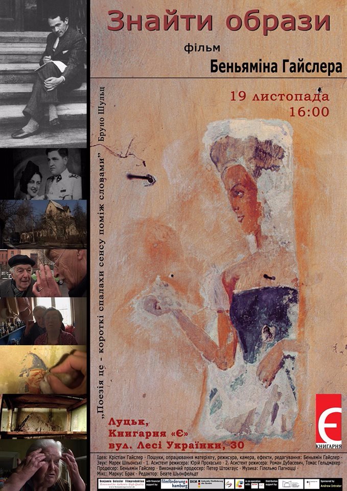 Книгарня «Є» та Кіностудія Беньяміна Ґайслера запрошують на показ документального фільму «Знайти образи» (Німеччина, 2002, реж. Беньямін Ґайслер, 106 хв), що відбудеться 19 листопада з нагоди 75 роковин убивства Бруно Шульца.