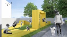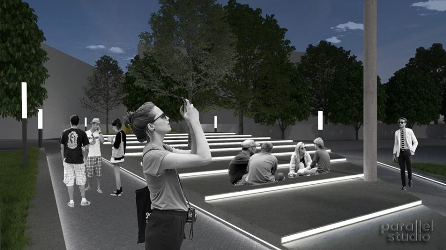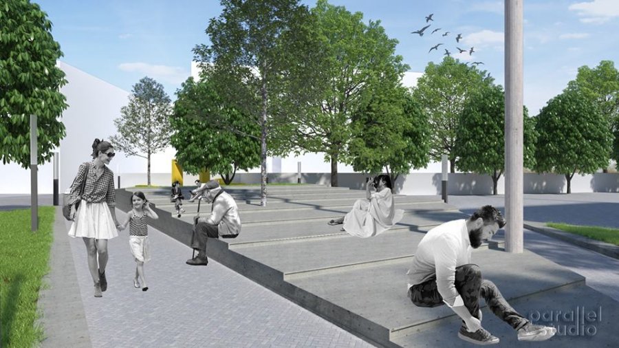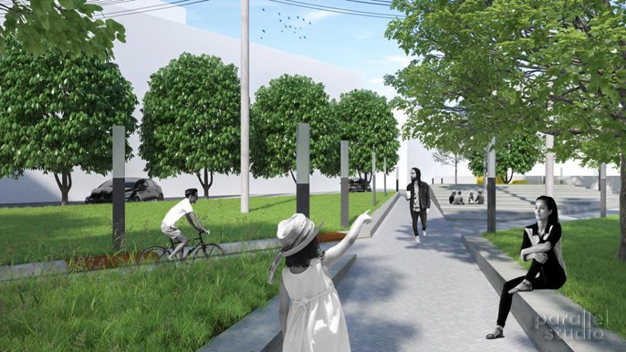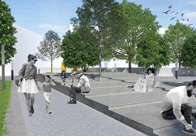 "На перетині основних пішохідних шляхів влаштовується вуличний театр з бетонним покриттям сходинок. Зелені зони газону всередині парапетів реалізовані для дитячих ігор, пікніків та інших видів відпочинку. Біля воріт поліклініки організовується дитячий ігровий майданчик з можливістю лазання, хованок, ловів і також комунікації більшої кількості дітей (класу чи групи) з круговидною зоною посадки".