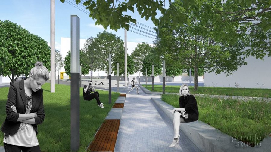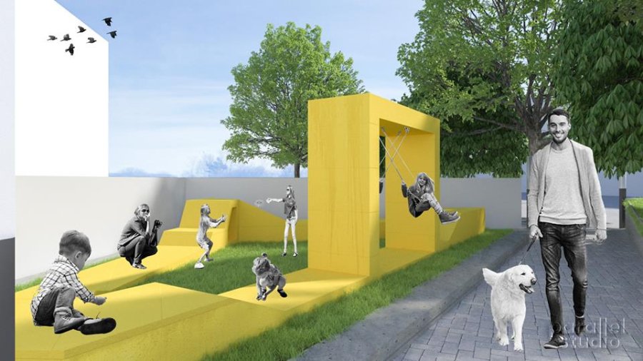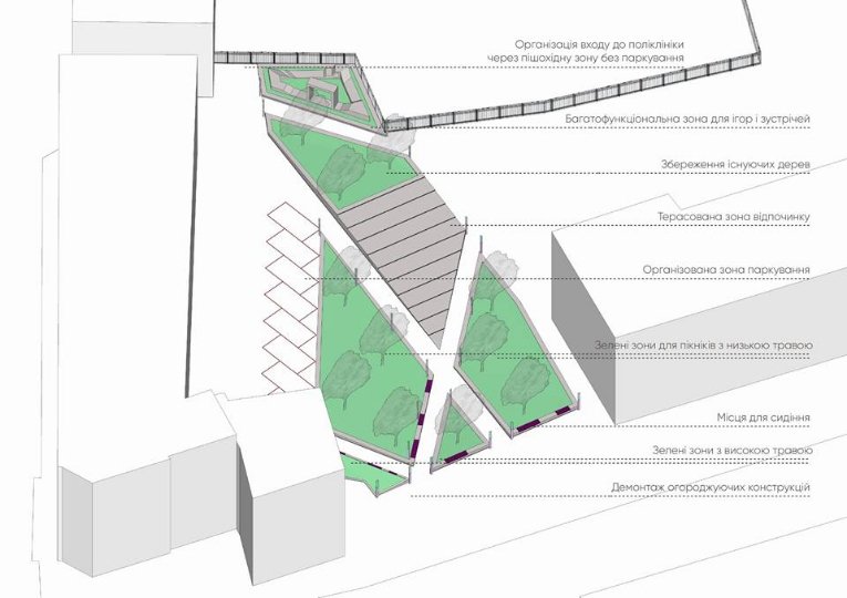 "Концепція пропонує організацію паркувальних місць безпосередньо збоку скверу і забезпечення доступу до них виключно жителів будинку та службового транспорту поліклініки. Паркувальні місця біля воріт поліклініки пропонується замінити на дитячу зону, де б діти могли гратися близько від медичного закладу і на відстані від дороги".