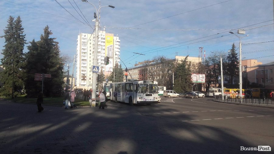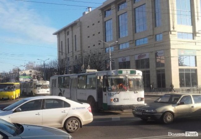 Через поломку на контактній мережі у центрі Луцька утворився затор із тролейбусів.
