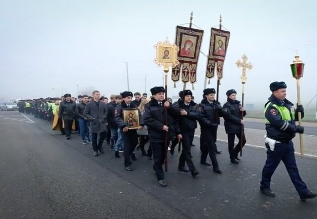 У Росії близько 100 співробітників Головного управління по забезпеченню безпеки дорожнього руху взяли участь у хресній ході на небезпечній ділянці траси в Краснодарі.