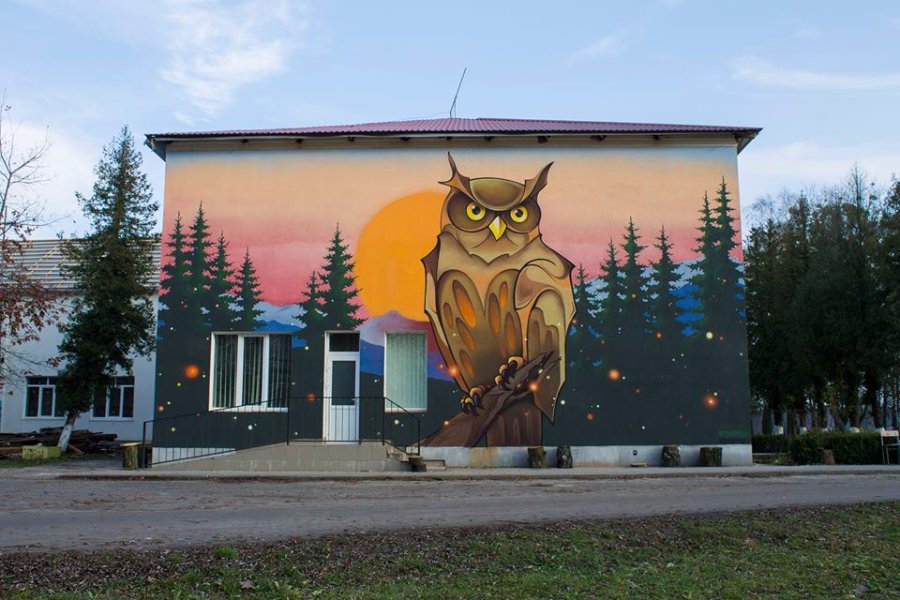 У селі Заброди на стіні школи намалювали величезний малюнок з совою.