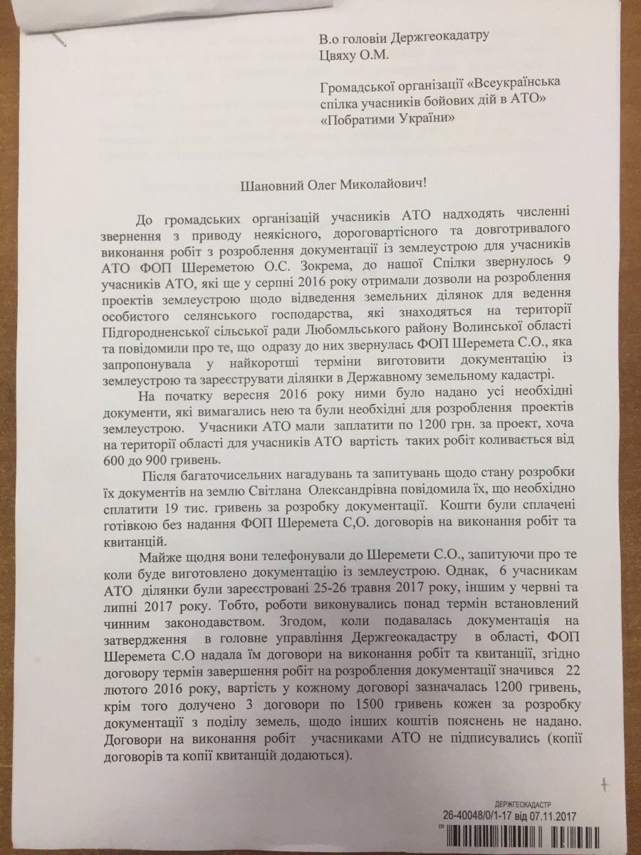 У листі, опублікованому на сайті Держгеокадастру, бійці скаржаться, на те що у серпні 2016 року отримали дозволи на отримання земельних наділів в Любомльському районі, після чого до них відразу ж нібито звернулась Світлана Шеремета та запропонувала їм послуги з виготовлення необхідних документацій у найкоротший термін і вже на початку вересня їй надали документи, які вимагались нею.