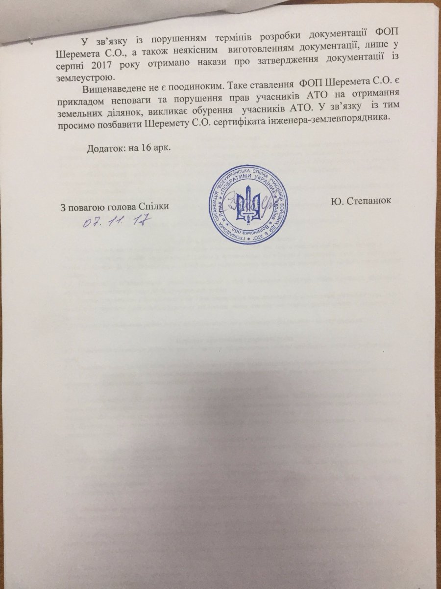 "Таке ставлення ФОП Шеремета С.О. є прикладом неповаги та порушення прав учасників АТО на отримання земельних ділянок, викликає обурення учасників АТО", - резюмували події у Спілці.