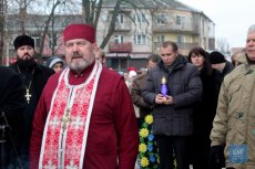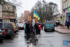 Таким флешмобом зустріли хресну ходу від собору Різдва Христового. Хода на кілька хвилин зупинила на площі Героїв та представники місцевої влади та духовенства поклали квіти до дошки Пам’яті Герої АТО.