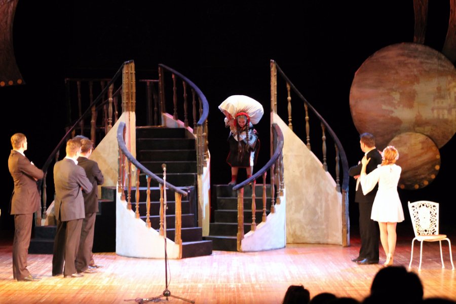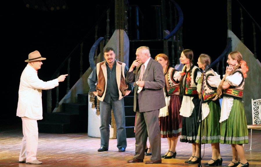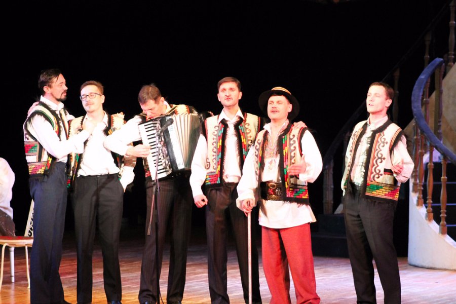 На сцені Волинського академічного обласного українського музично-драматичного театру імені Т. Г. Шевченка виступали народні артисти України: Євген Федорченко (Іван Синиця), Богдан Козак (Майк Деделюк), Дарія Зелізна (Гелен Зілинська) та Степан Глова (Зілинський, професор біології). А також Олександра Люта у ролі Гуцулки Ксені, Назарій Московець (Яро), Надія Шепетюк (Марічка), Ігор Гаврилів (Комісар поліції), Мар’яна Фехтель (Мері) та Орест Огородник (Юрко).