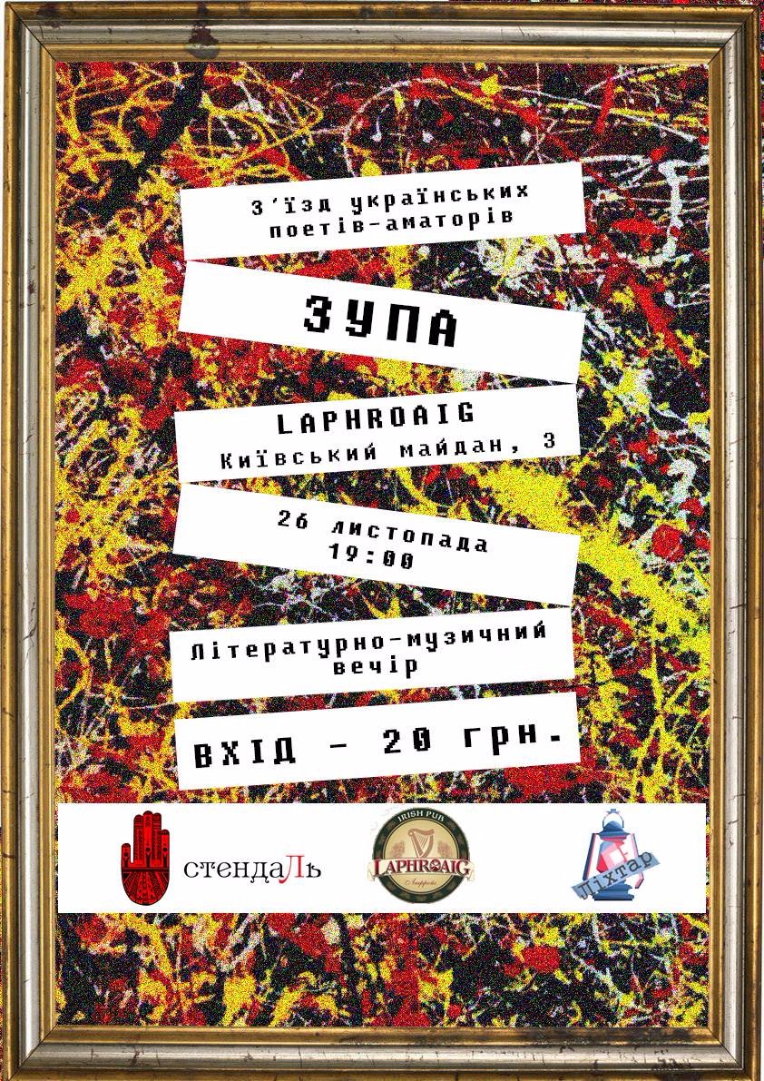 «ЗУПА — безпрецедентна подія, адже в ній братимуть участь молоді поети зі всієї країни. Познайомитися з поетами кличуть у неділю, 26 листопада. Крім звичайного літературного вечора, який відбудеться о 19:00, в пабі «Laphroaig» (Київський майдан, 3), буде кілька перформансів та акцій у різних локаціях міста.