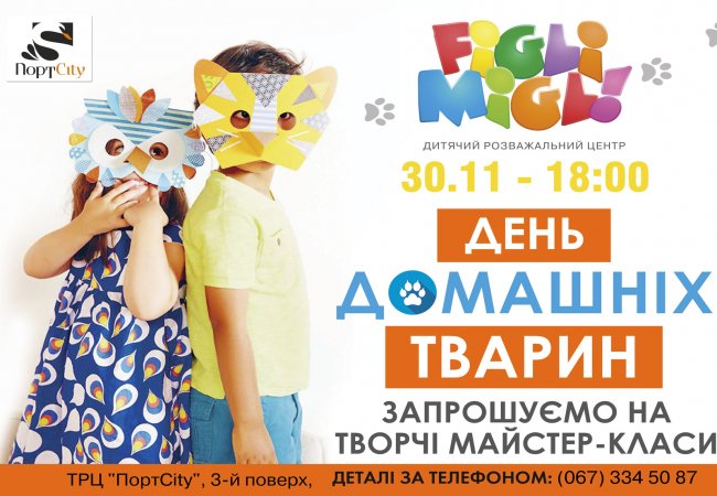 Дитячий розважальний центр «Figli Migli» запрошує малят на день домашніх тварин. Дітлахи мають нагоду виготовити маску улюбленого звіра.
