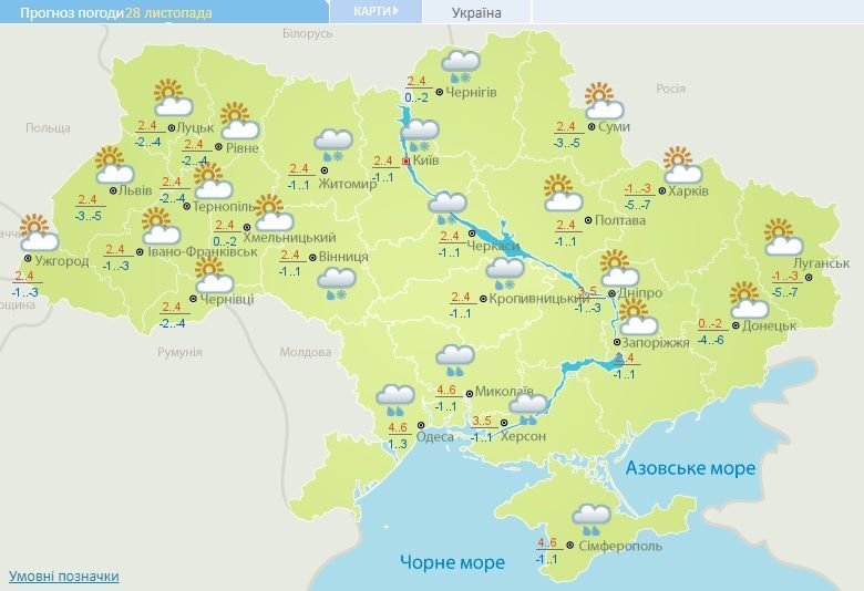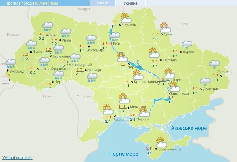 29 листопада в Україні невеликі, 30 листопада у східній частині, вдень і в західних, Житомирській, Вінницькій та Київській областях помірні опади у вигляді дощу та мокрого снігу.