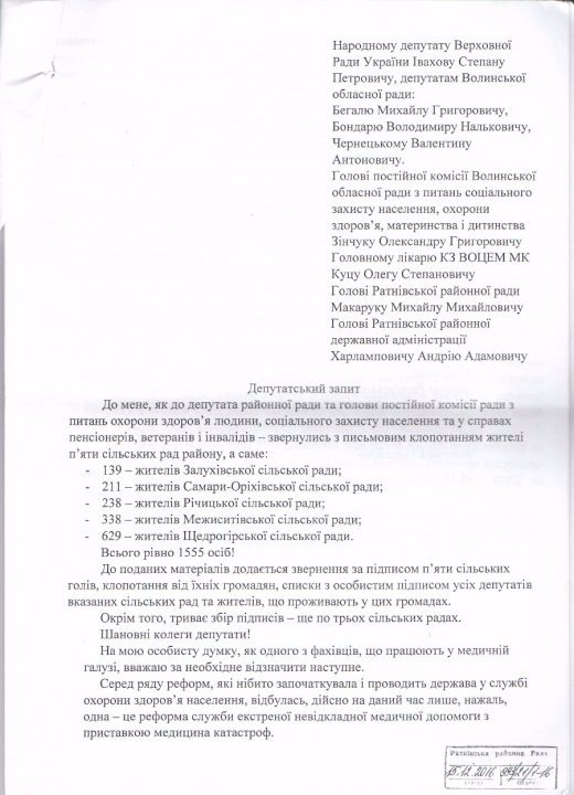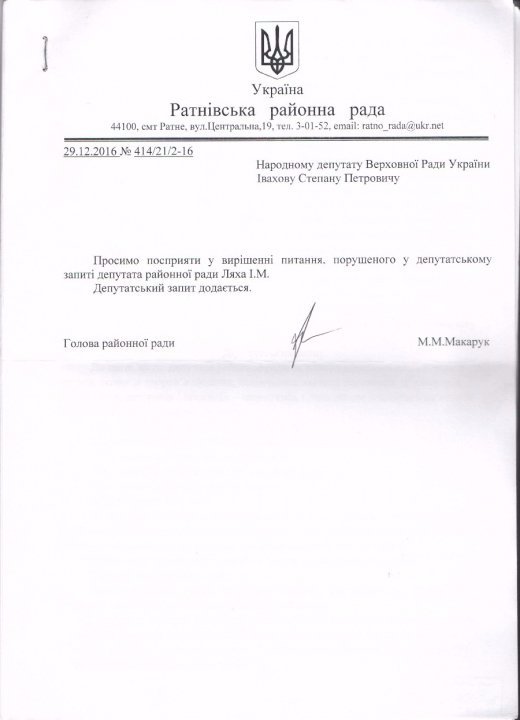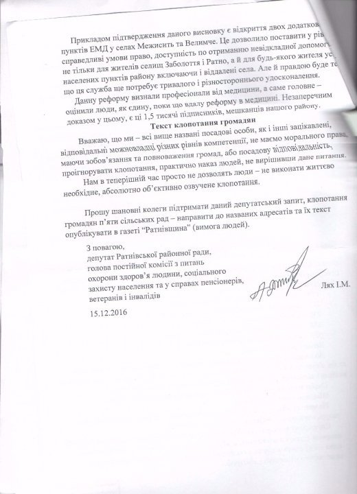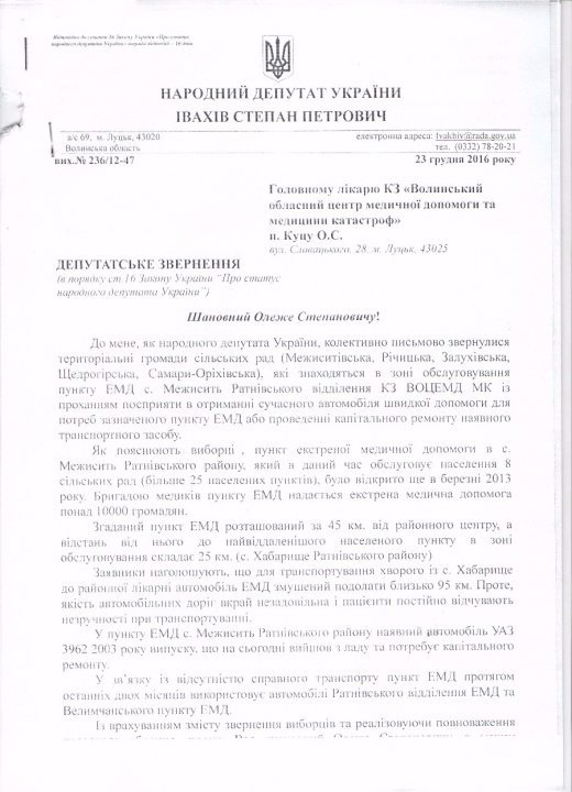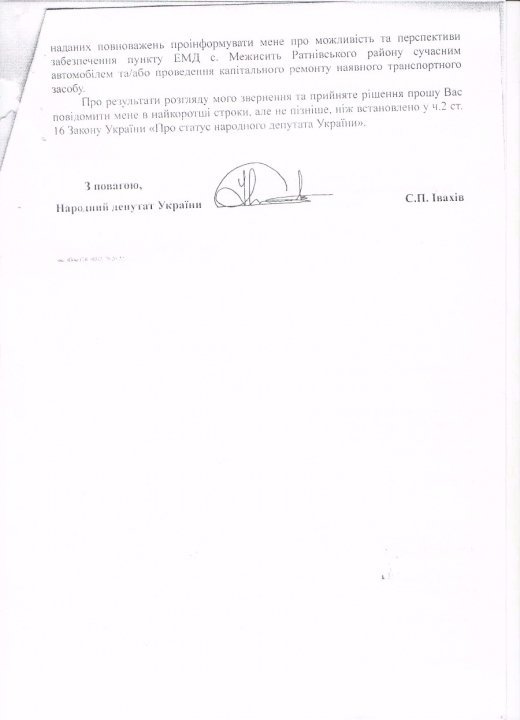В грудні 2016 року до народного депутата Степана Івахіва звернувся голова Ратнівської районної ради, керівник місцевого осередку партії «УКРОП» Михайло Макарук з проханням посприяти, аби пункт швидкої допомоги у селі Межисить на Ратнівщині отримав реанімобіль. Під зверненням підписалися 1500 мешканців п’яти сільських рад, які обслуговує цей пункт екстреної медичної допомоги (ЕМД).