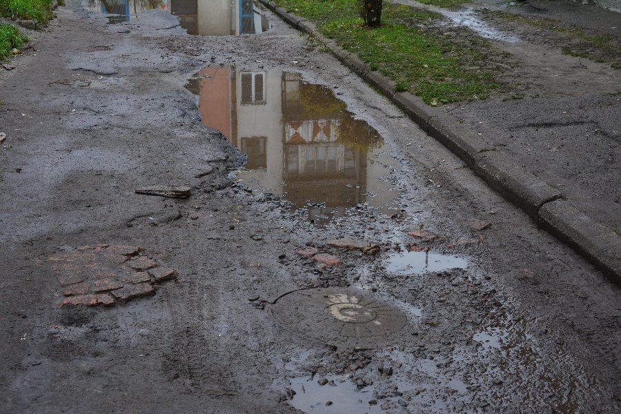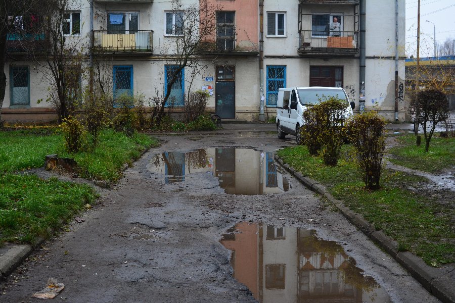 "На території двору є дійсно аварійні похилені дерева, встім, їх не чіпали - деревина не та...На пальне для бензопил і техніки і все решта - бабки є, поремонтувати двір (фото чудових калюж - нижче) - немає. Не ту країну назвали Гондурасом! Екологічна інспекція, міськрада і т.д. - повідомлені", - зазначає лучанин.