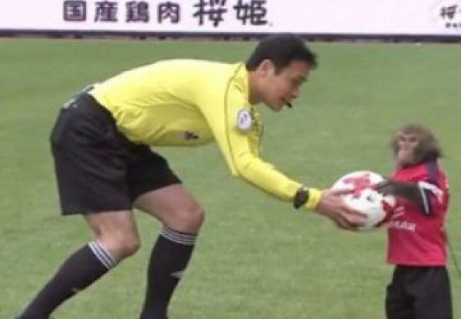 Команди «Карезо Осака» і «Віселл Кобе» вийшли на футбольне поле і залишалося лише доставити судді м'яч. Зазвичай його виносять або діти, або ж арбітр бере його зі спеціальної підставки, але в цьому поєдинку на допомогу прийшла мавпа.