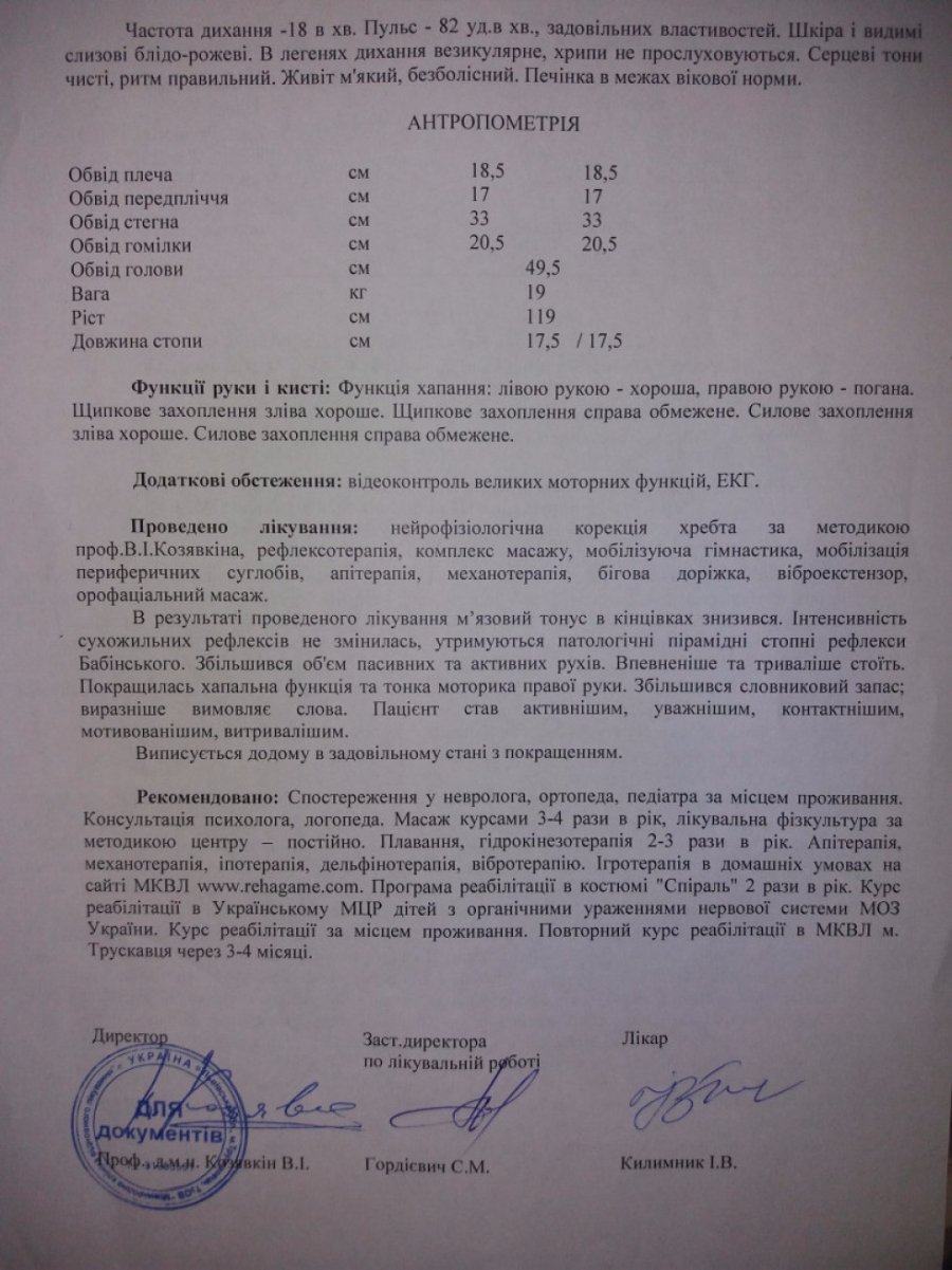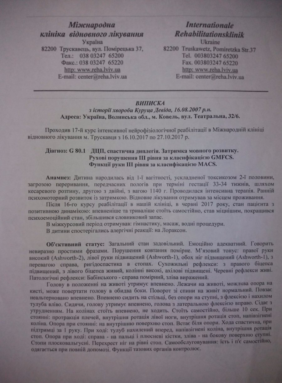 «Пiсля пройдених курсiв лiкування в клiнiцi, синок досягнув великих результатiв: він може перевертатися, повзати, сидіти, вставати біля опори, ходити з пiдтримкою за ручки, може невелику вiдстань пройти, тримаючись за одну ручку. Давид навчається за індивідуальною програмою. Лікарі дають хороші прогнози і кажуть, що синочок зможе самостійно ходити, але для цього потрібно i далi проходити курси реабілітації в клiнiцi 3 рази на рік, щоб не втратити позитивної динаміки одужання», – зізнається ковельчанка.