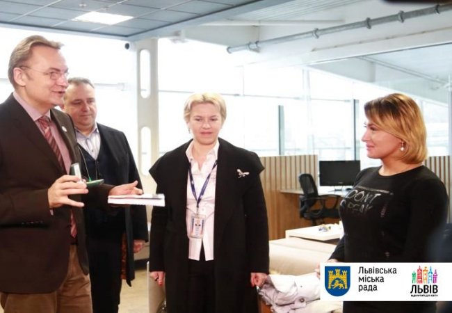 Міський голова Львова Андрій Садовий привітав пасажирку Вікторію та подарував монету Короля Данила Галицького та книгу про Львів.