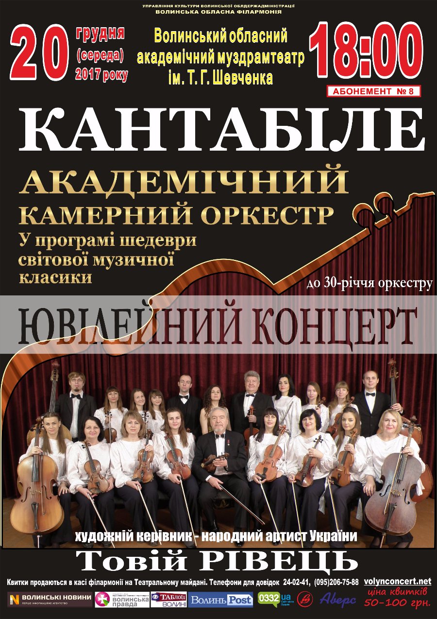 Шанувальники таланту музикантів “Кантабіле” й, зокрема, його керівника ‒ народного артиста України Товія Рівця, ‒ матимуть нагоду почути у виконанні улюблених артистів шедеври світової музичної класики.