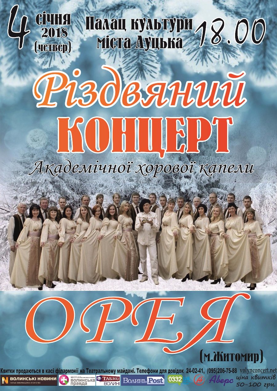 Один із найкращих хорових колективів України і Європи ‒ Академічна хорова капела “Орея” (м. Житомир) 4 січня 2018 року виступить у Палаці культури міста Луцька з різдвяною концертною програмою.