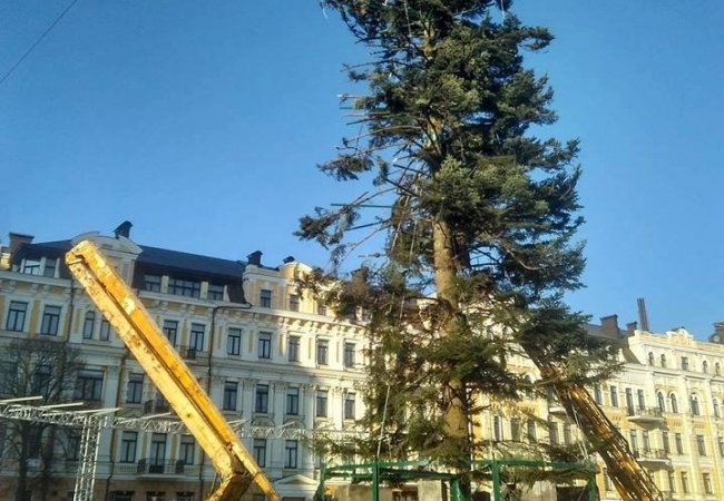 Головну новорічну ялинку України, яку 7 грудня підняли на Софійській площі, все ще кріплять на конструкції.