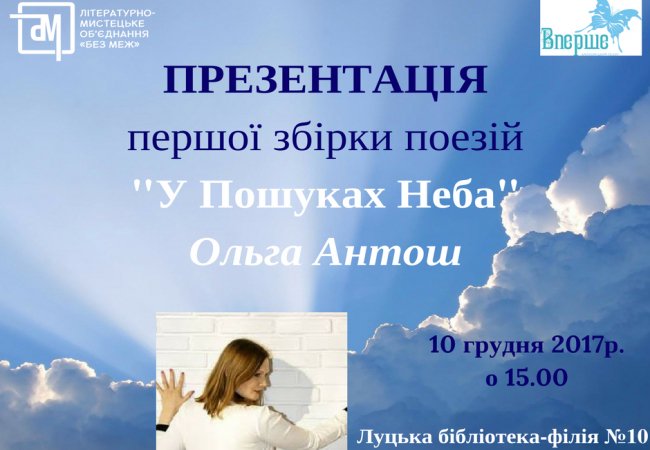 В клубі літературних презентацій «Вперше», що діє у луцькій бібліотеці-філії 10 (Київський майдан,13) 10 грудня о 15.00 відбудеться презентація збірки поезій талановитої молодої авторки Ольги Антош.