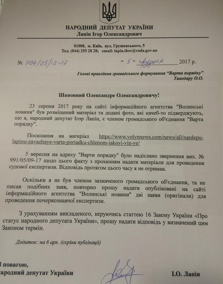 Народний депутат Ігор Лапін вимагає в очільника "Варти порядку" Олександра Тиводара надати йому заяви, які нібито підтверджують його приналежність до цього громадського формування.