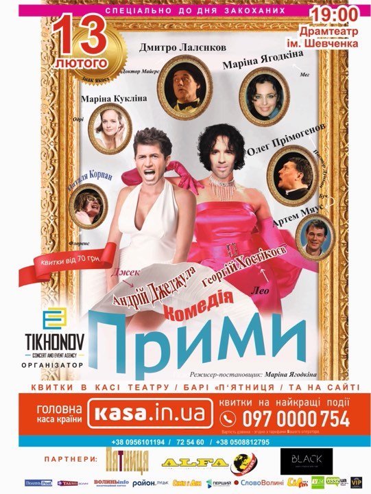 Квитки можна придбати у барі «П’ятниця» (проспект Волі 17 та бульвар Дружби Народів 13А), касі драмтеатру та на сайтіkasa.in.ua.