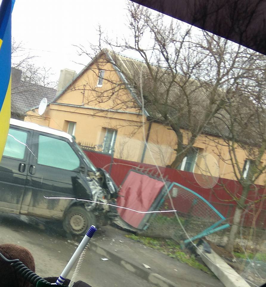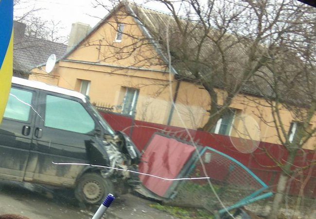 З фото видно, що у буса серйозно пошкоджена передня частина автомобіля. Крім того, в результаті автопригоди були пошкоджені металеві ворота і паркан.